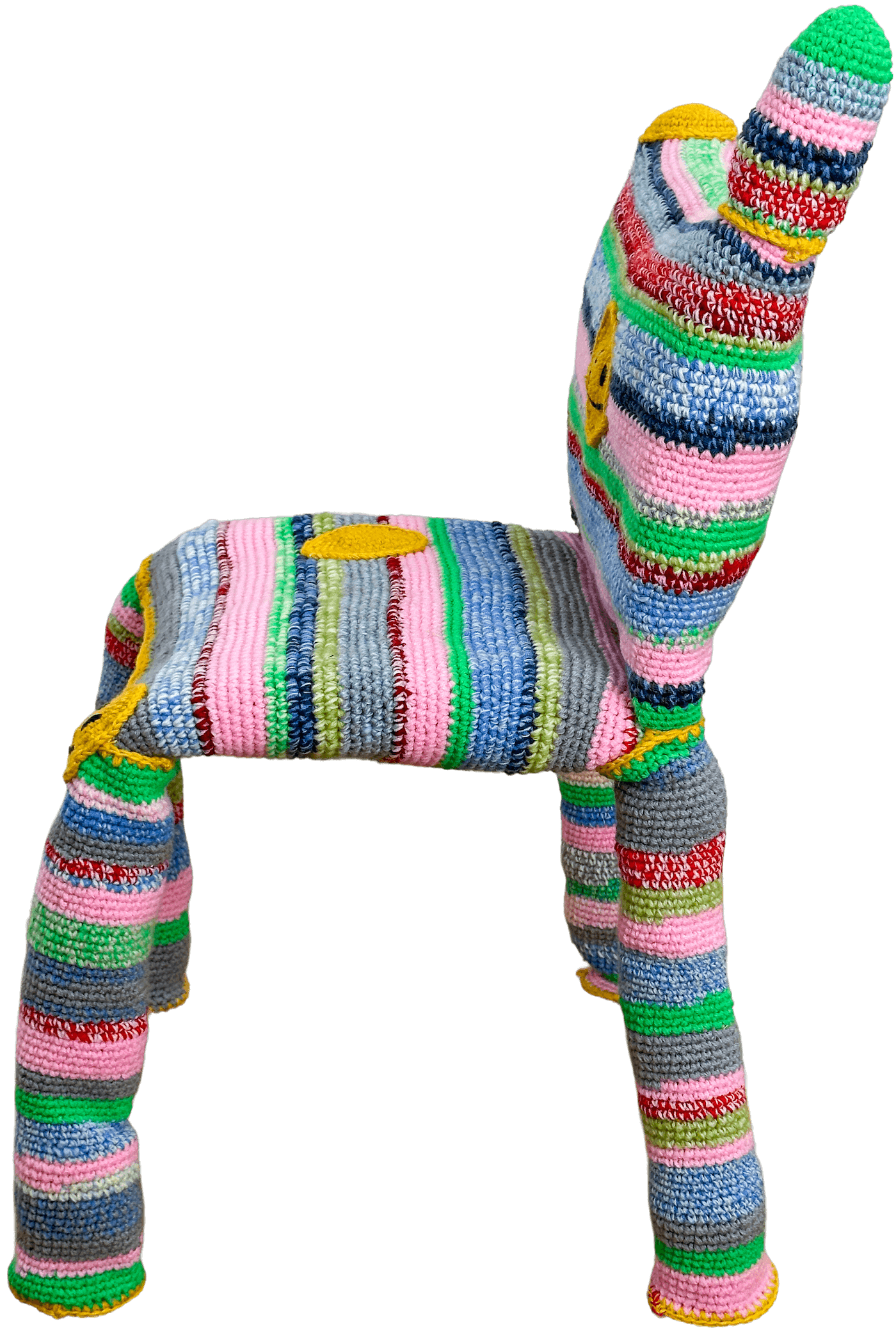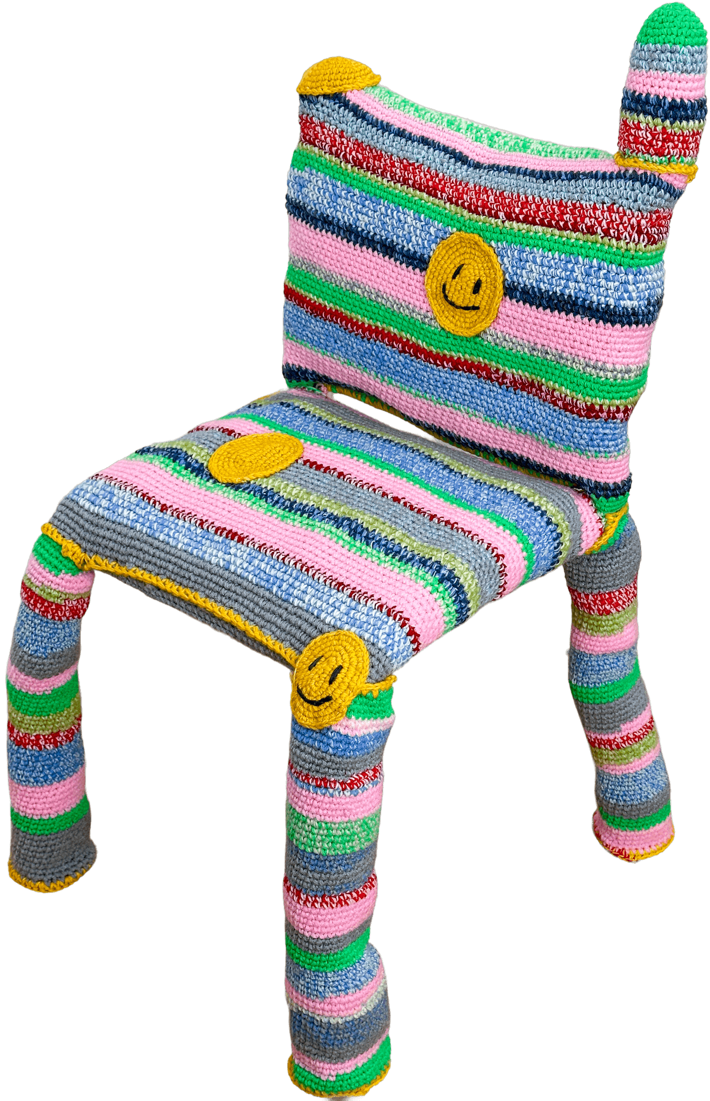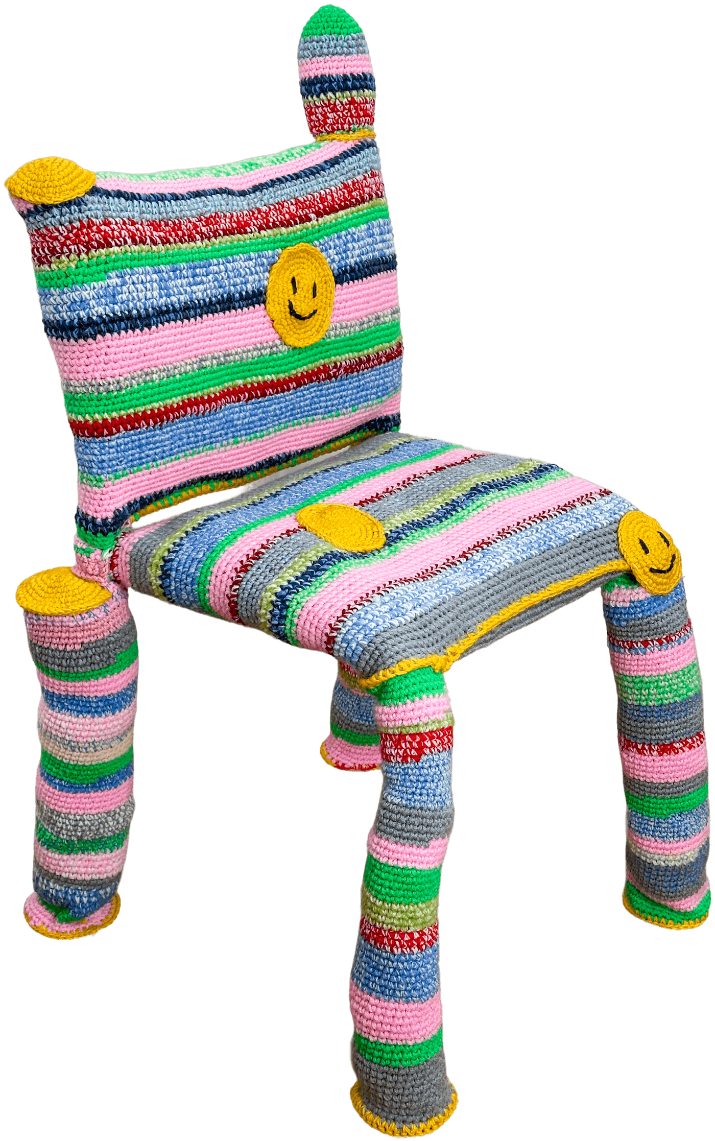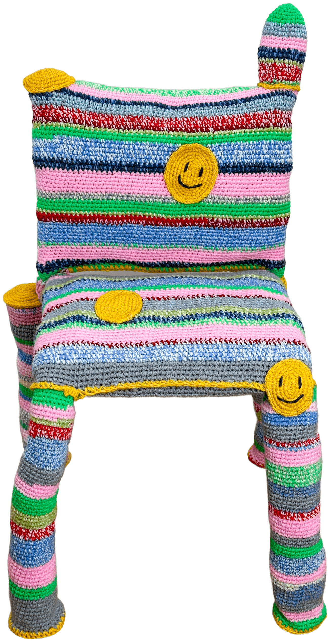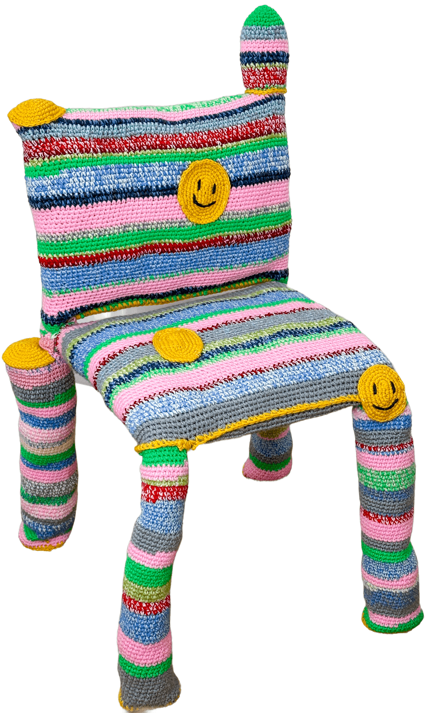 Wrapped in layers of crocheted yarn and scattered with smiling faces, the chair becomes a soft archive of restlessness. Each stitch records a moment of unease, turning anxiety into shelter - a domestic object slowly remade through repetition, touch, and the quiet labour of self-soothing.