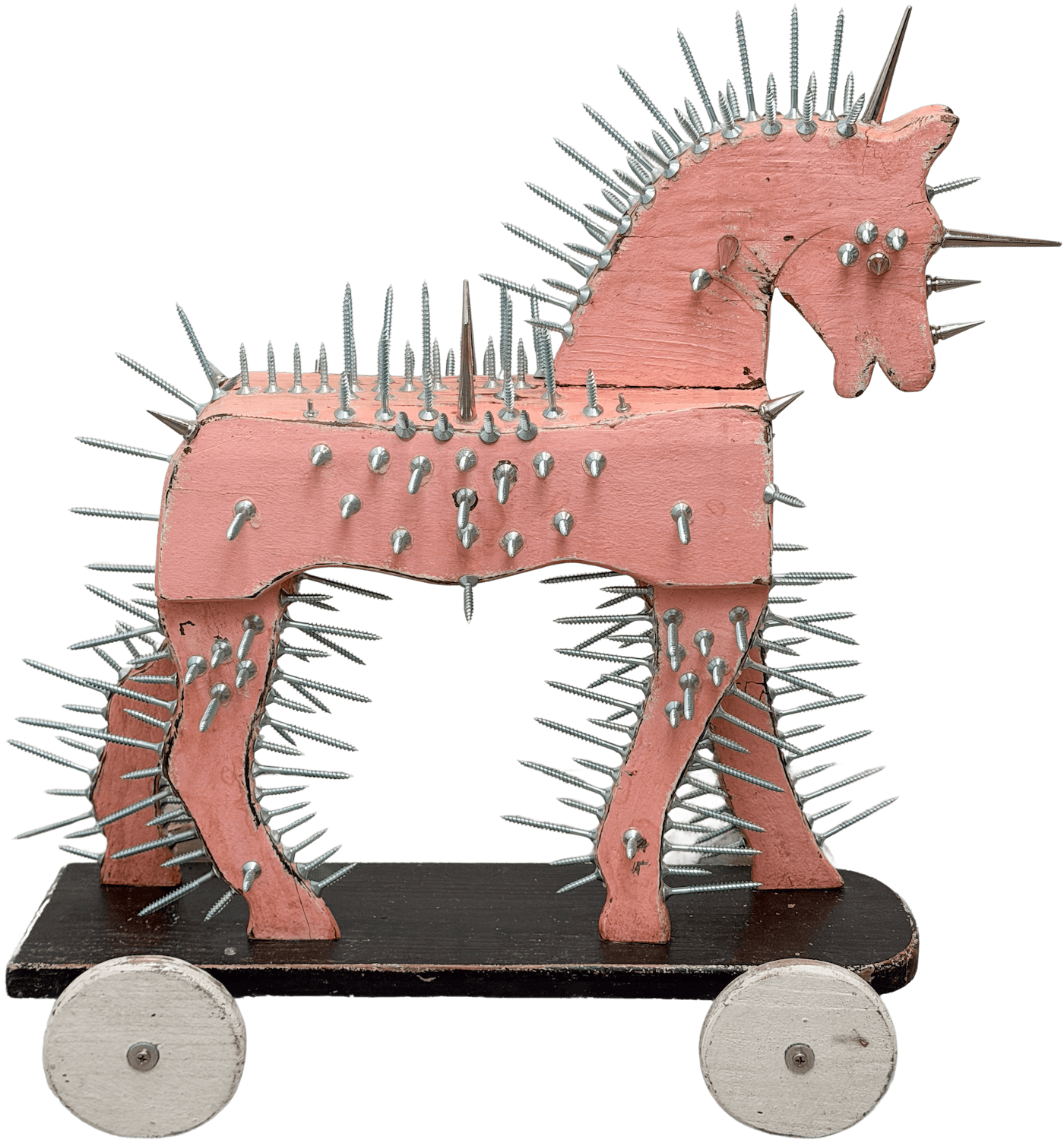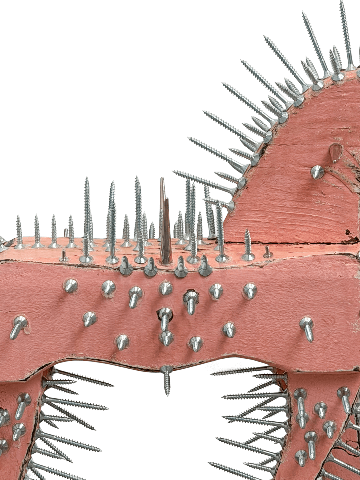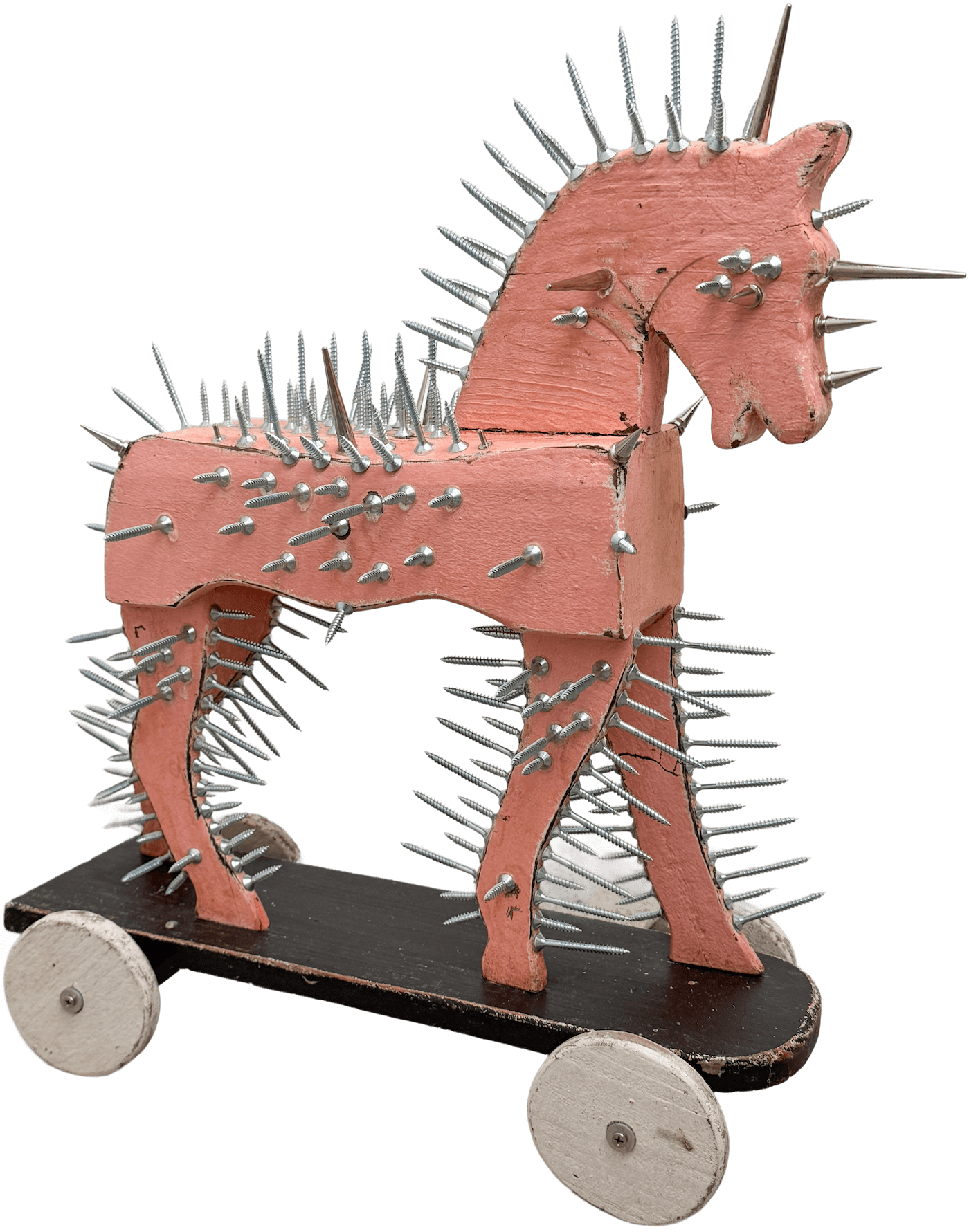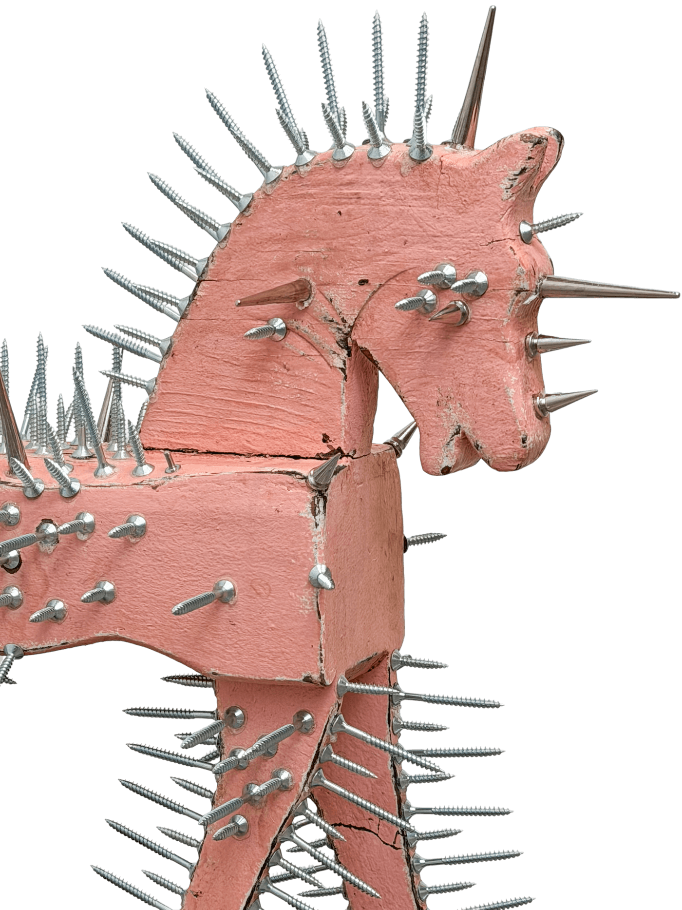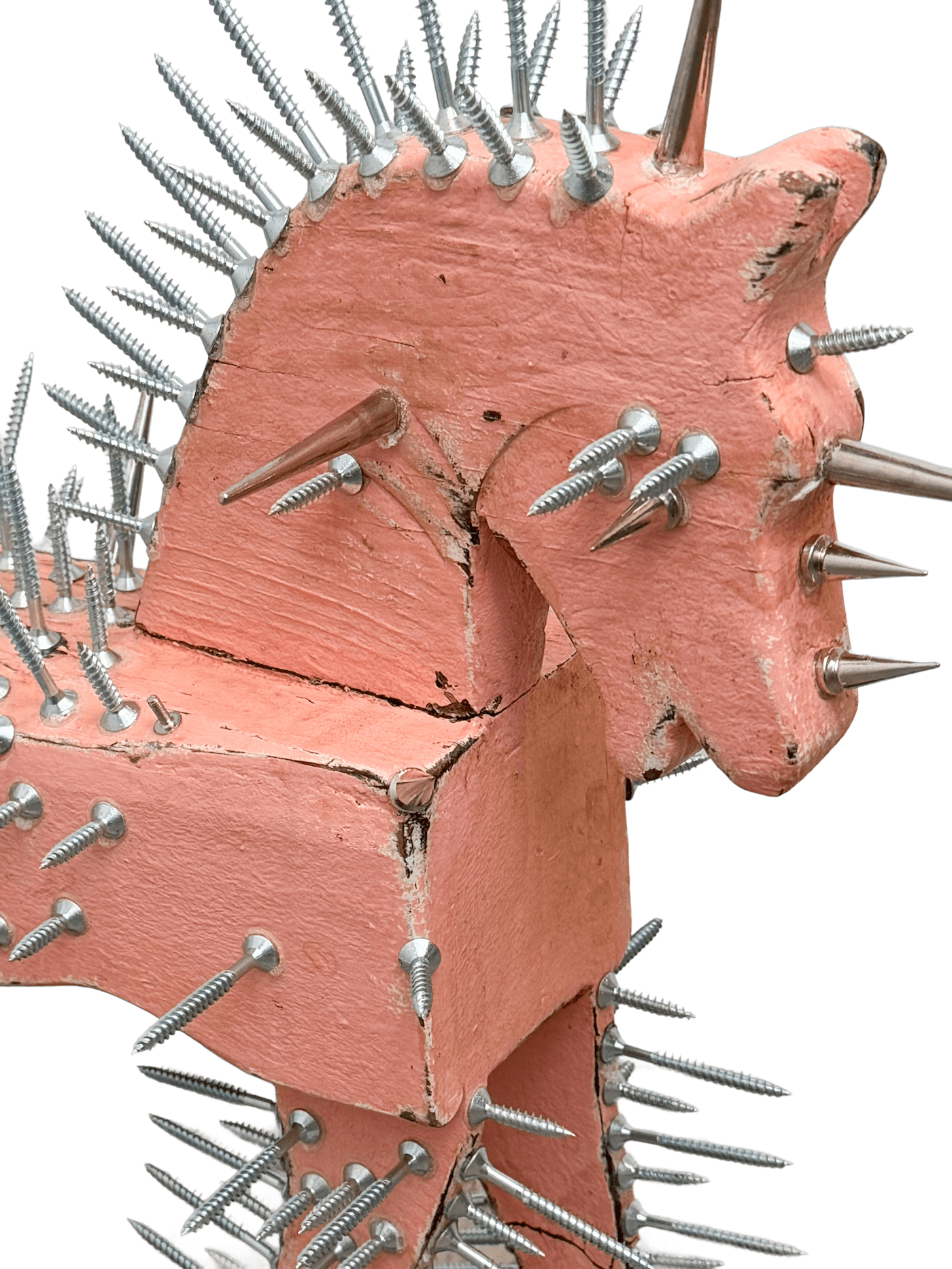 A candy-pink rocking horse bristling with nails and spikes transforms play into peril. Childlike movement persists, but comfort is weaponised - innocence sharpened into endurance, where tenderness and threat quietly coexist.